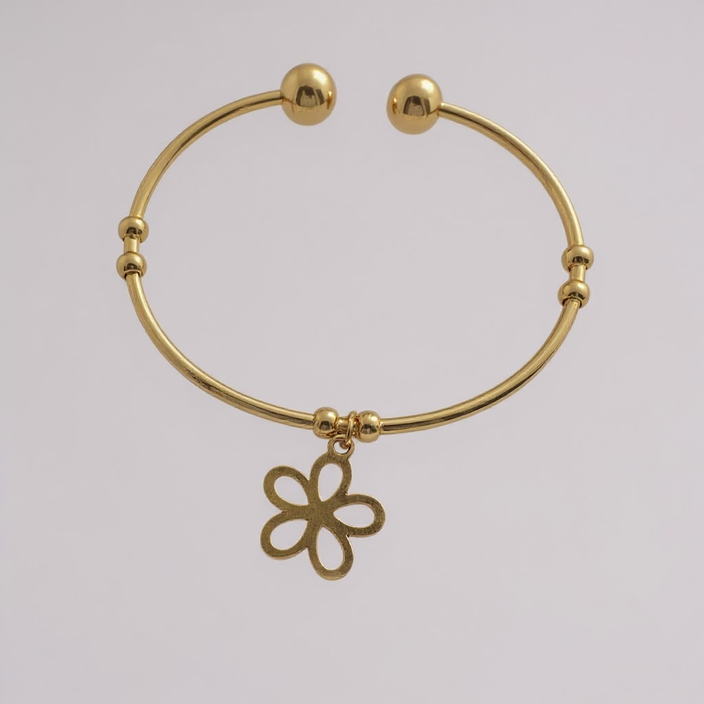 Laissez entrer la fraîcheur et la douceur de la nature dans votre style avec ce bracelet jonc en acier inoxydable orné d’un pendentif fleur. Délicat et raffiné, il se porte facilement seul ou en accumulation avec d’autres bijoux.
