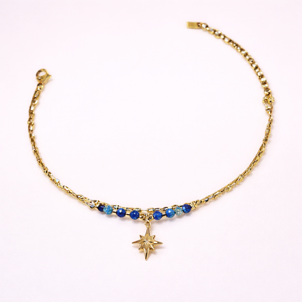 Le bracelet "Mia" brille d’une délicatesse étoilée. Les perles facettées aux reflets profonds accompagnent une étoile dorée suspendue, telle une promesse murmurée à l’univers. Une pièce élégante qui capte la lumière et sublime chaque mouvement du poignet.