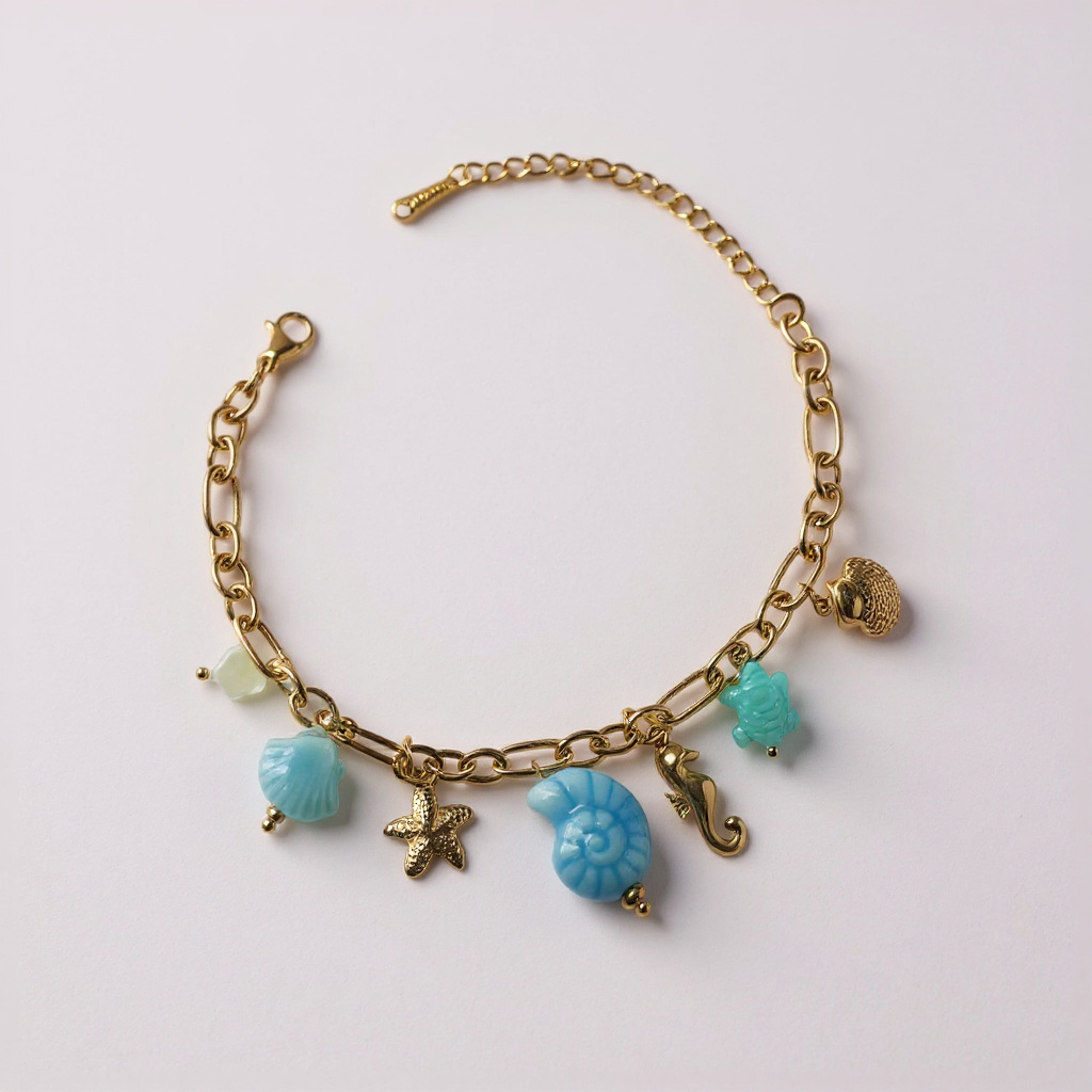 Plongez dans un univers marin avec ce bracelet charms inspiré des trésors de l’océan. Sa chaîne dorée accueille des pendentifs délicats – coquillages turquoise, hippocampe doré, étoile de mer scintillante – pour un bijou qui capture la lumière et les rêves d’évasion. Léger et ajustable, il apporte une touche estivale et élégante à toutes vos tenues.