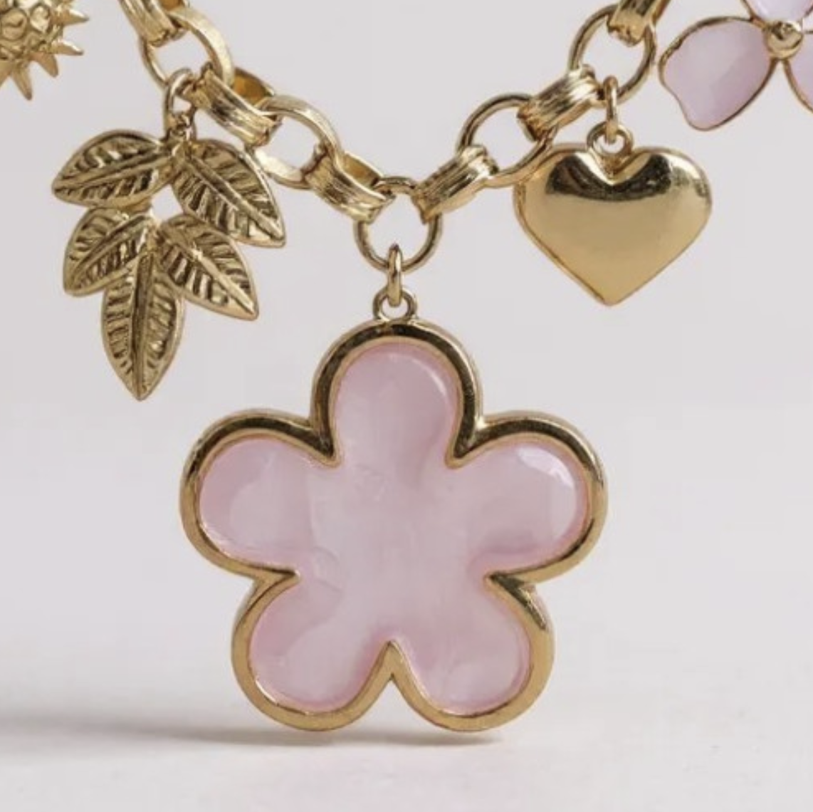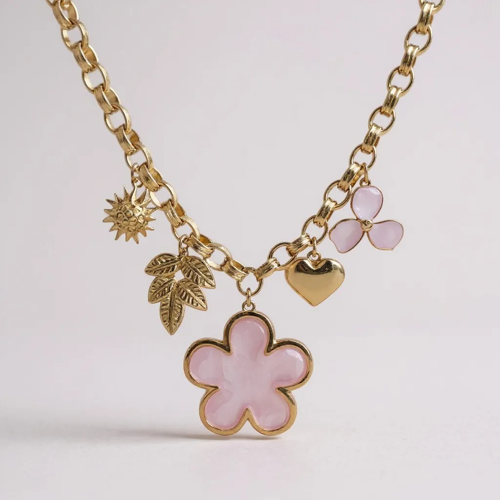 Un collier lumineux qui célèbre la féminité et la douceur 🌸. Sa chaîne dorée accueille une série de charms raffinés : une grande fleur émaillée, un trèfle délicat, une feuille, un soleil rayonnant et un petit cœur doré. Chaque détail apporte une symbolique unique, faisant de ce bijou un porte-bonheur élégant et personnalisé.