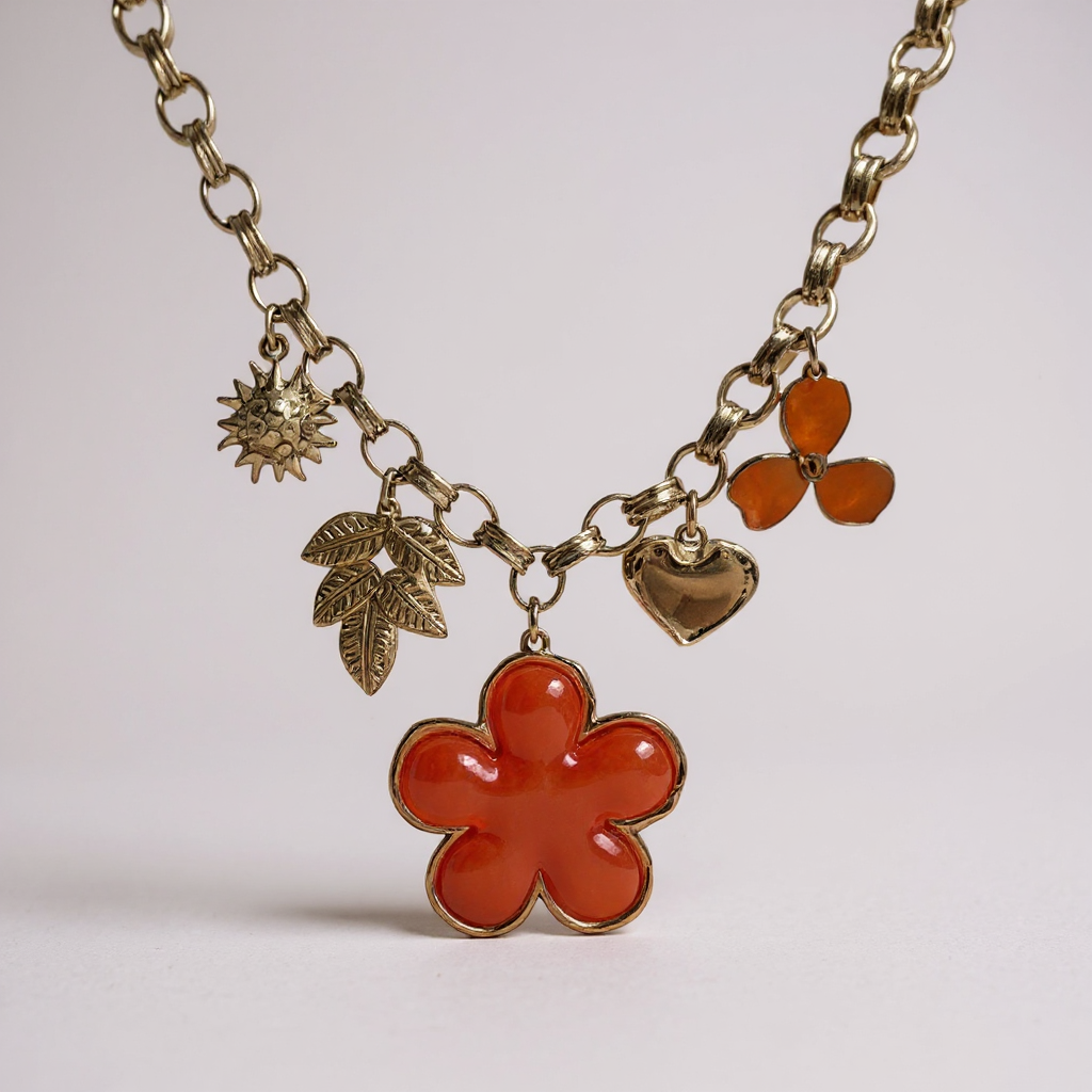 Un collier lumineux qui célèbre la féminité et la douceur 🌸. Sa chaîne dorée accueille une série de charms raffinés : une grande fleur émaillée, un trèfle délicat, une feuille, un soleil rayonnant et un petit cœur doré. Chaque détail apporte une symbolique unique, faisant de ce bijou un porte-bonheur élégant et personnalisé.