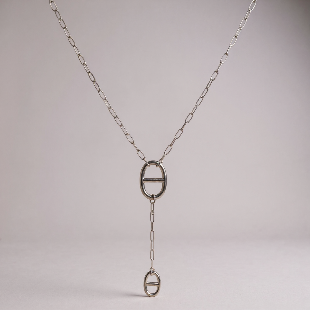 Élégant et moderne, ce collier long en acier inoxydable argenté se distingue par son pendentif composé de maillons ovales ajourés. Avec sa longueur de 55 cm (+ 5 cm de chaîne réglable), il habille le décolleté avec finesse et apporte une touche contemporaine à toutes vos tenues.