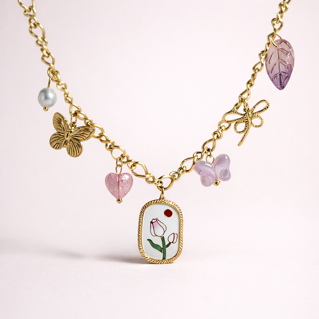 Le Collier Jardin Enchanté est une invitation à la poésie et à la délicatesse. Sa chaîne dorée se pare de multiples charms raffinés : papillon, libellule, feuille violette translucide, cœur rose, perle nacrée et un médaillon fleuri peint d’une tulipe. Chaque détail évoque la nature et la douceur printanière, pour un bijou unique qui illumine vos tenues.