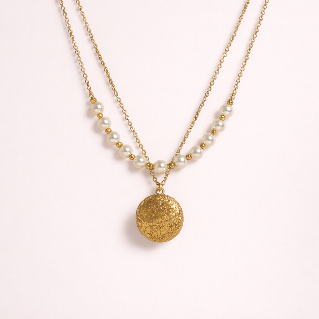 Un collier double rang élégant et chic, composé d’une fine chaîne dorée et d’un rang de perles blanches nacrées. Au centre, un médaillon rond gravé doré vient sublimer l’ensemble. Une pièce sophistiquée qui marie tradition et modernité.