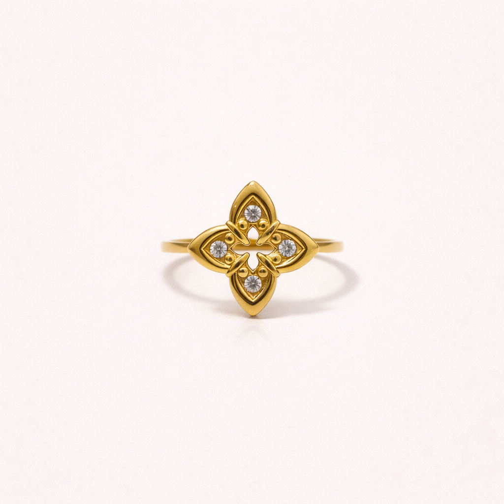 Délicate et raffinée, la bague Élise séduit par son motif floral finement travaillé. Son design ajouré, rehaussé de strass lumineux, apporte une touche d’élégance subtile qui habille la main avec douceur et féminité.