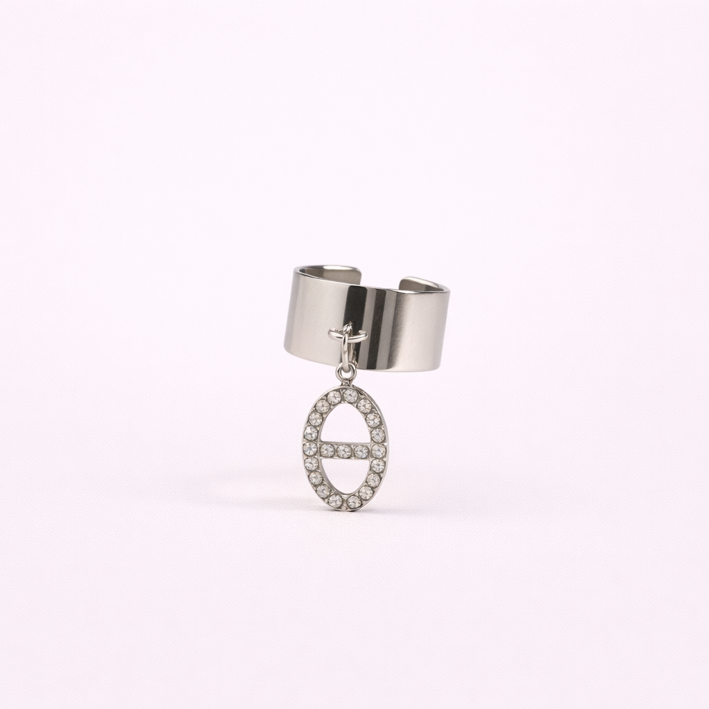 Élégante et moderne, cette bague se distingue par son anneau large argenté et son pendentif maille marine délicatement serti de zircon. Le contraste entre la structure minimaliste de l’anneau et l’éclat des pierres crée un bijou raffiné et lumineux. Son petit pendentif mobile apporte une touche originale qui attire subtilement le regard.