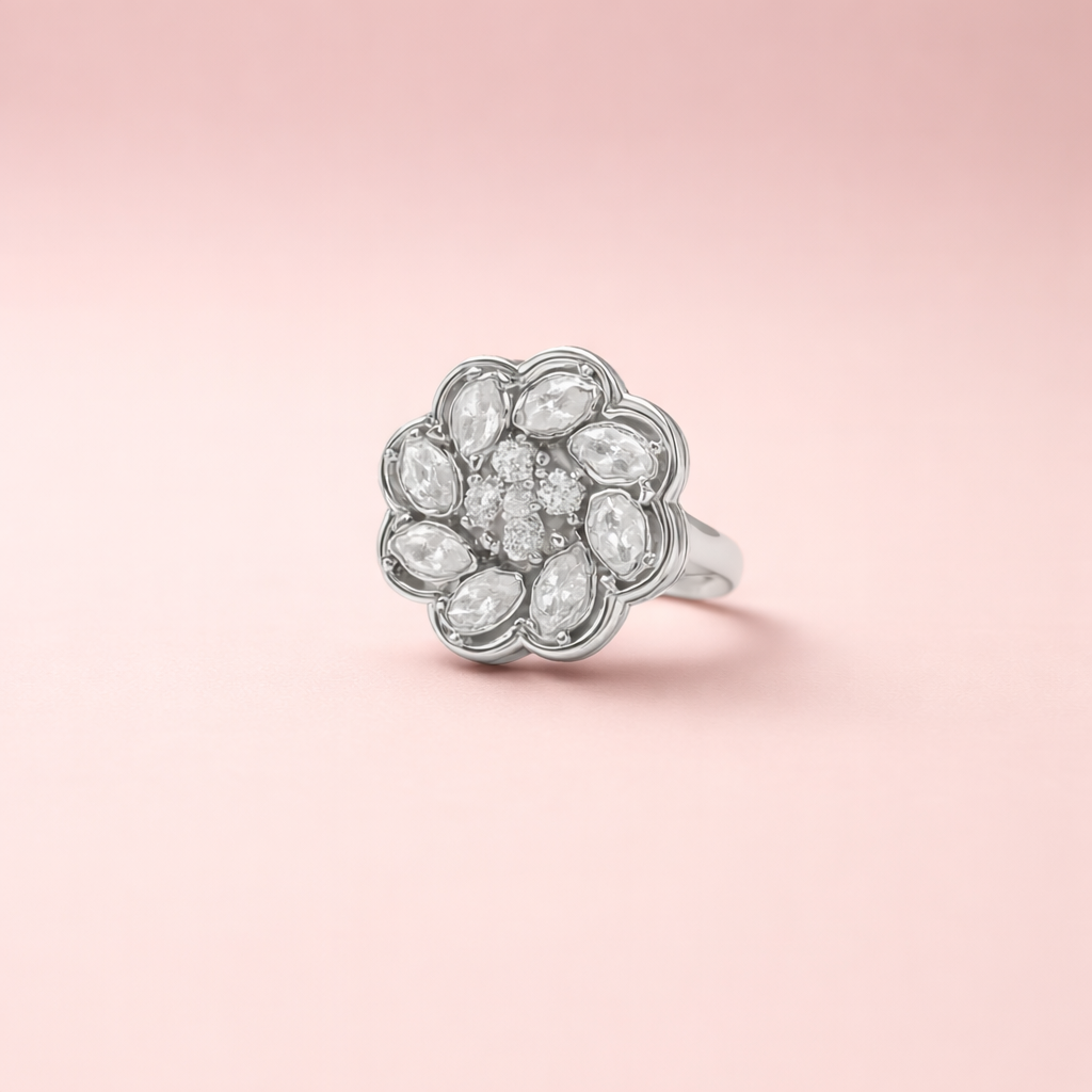 Élégante et lumineuse, cette bague antistress se distingue par son médaillon en forme de fleur serti de zircon scintillants. Les pierres taillées en pétales entourent un cœur délicatement pavé, créant un bijou raffiné qui capte la lumière avec élégance.