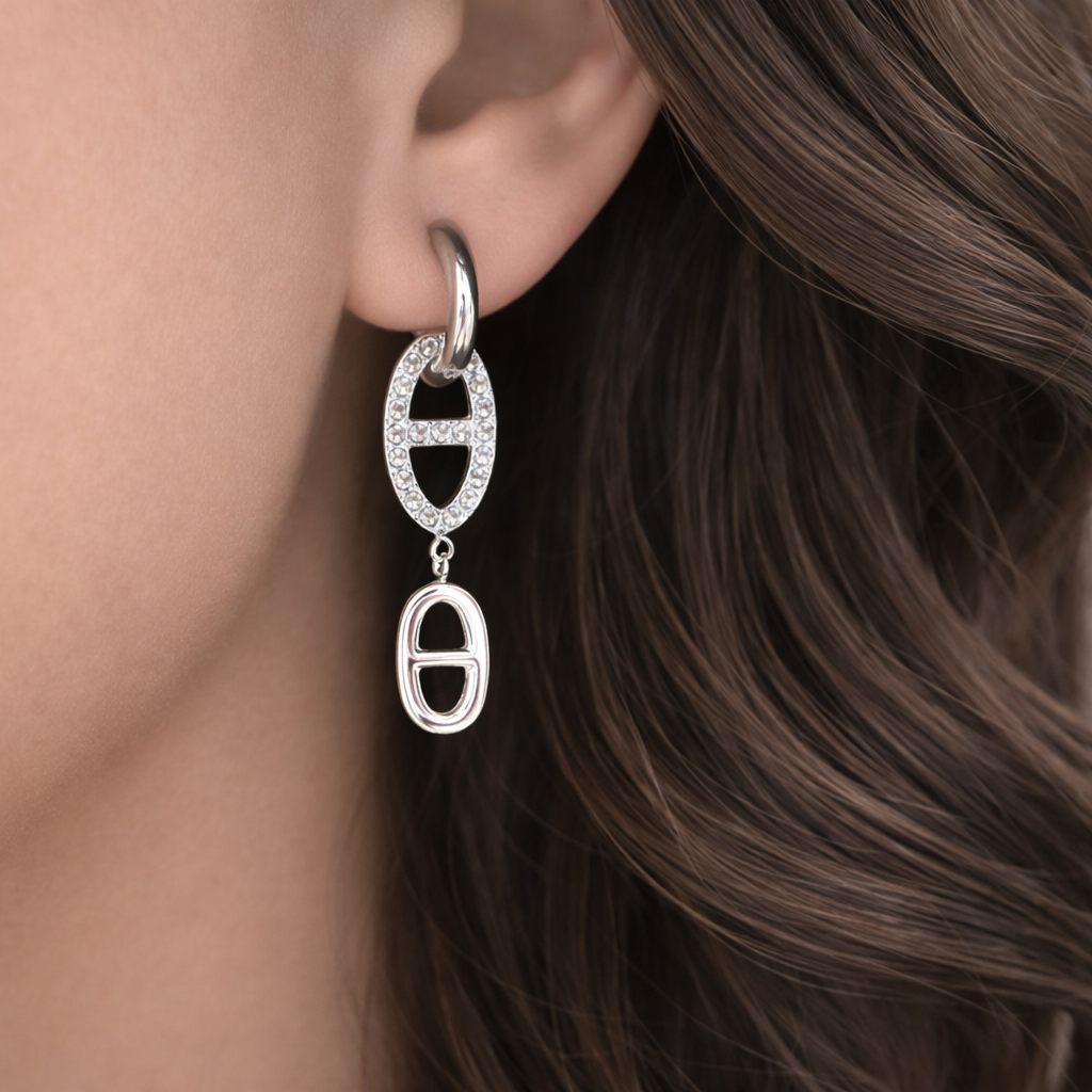 Composées d’une créole épaisse associée à un double motif ovale, elles jouent sur le contraste entre métal lisse et pavage de zircons scintillants. La pièce inférieure mobile apporte du mouvement et capte la lumière à chaque geste. Un bijou structuré, chic et tendance, parfait pour sublimer un look minimaliste ou accompagner une tenue plus habillée.