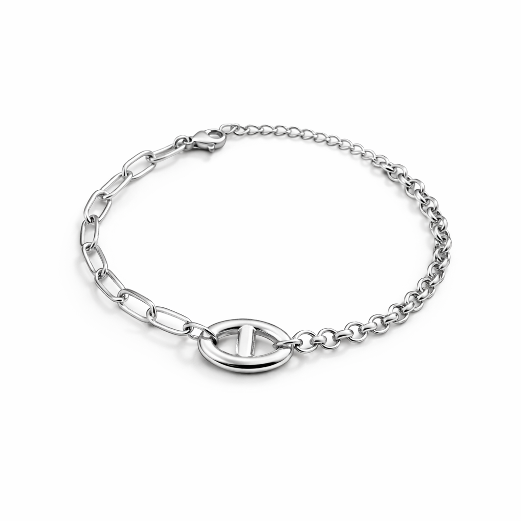 Élégant et moderne, ce bracelet associe deux styles de chaînes pour un effet tendance et raffiné. D’un côté, une maille marine ovale apporte du caractère au bijou, tandis que l’autre côté présente une chaîne plus fine et classique pour un équilibre parfait.