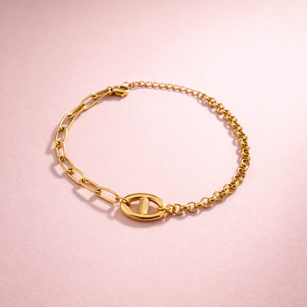 Élégant et moderne, ce bracelet associe deux styles de chaînes pour un effet tendance et raffiné. D’un côté, une maille marine ovale apporte du caractère au bijou, tandis que l’autre côté présente une chaîne plus fine et classique pour un équilibre parfait.