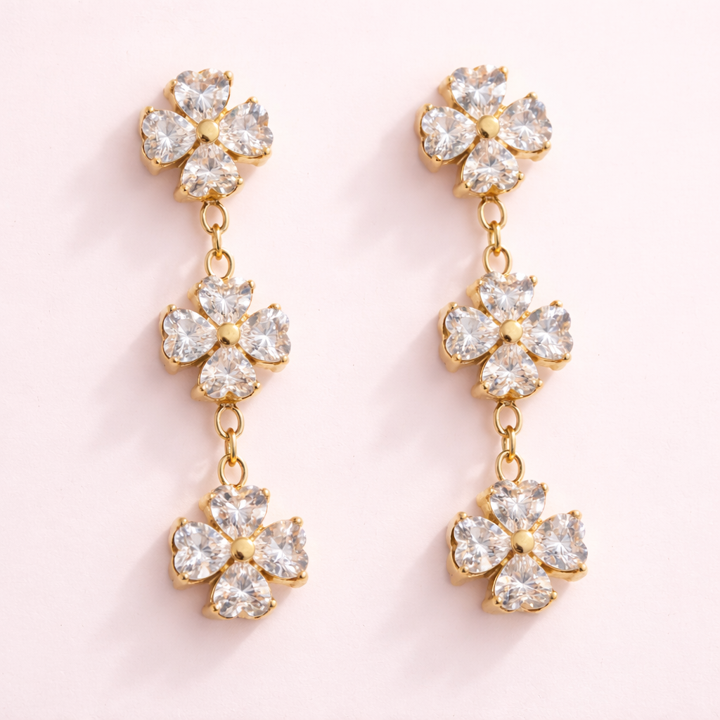 Élégantes et lumineuses, ces boucles d’oreilles mettent en valeur une cascade de fleurs serties de zircon qui captent la lumière à chaque mouvement. Leur design raffiné crée un effet délicat et féminin, parfait pour illuminer le visage.