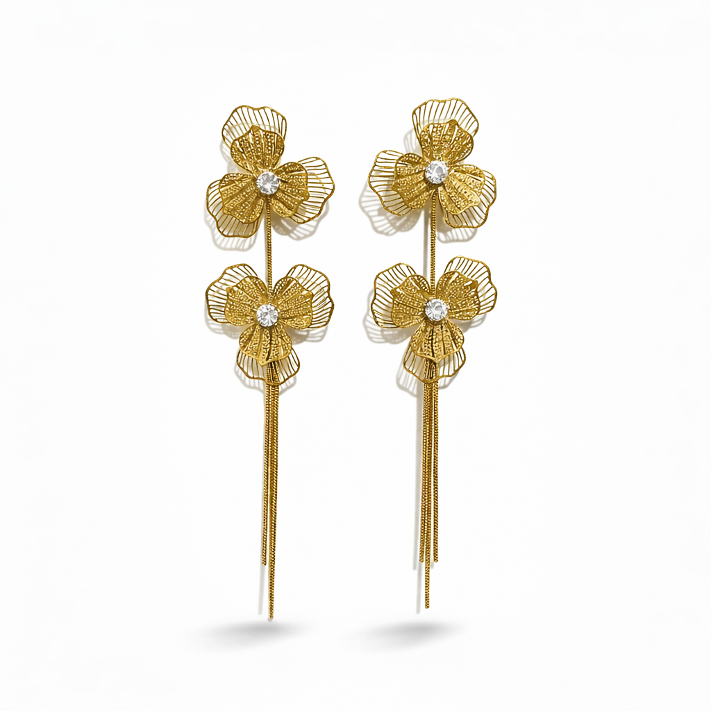 Élégantes et aériennes, ces boucles d’oreilles se distinguent par leur double fleur finement travaillée, associée à de délicates chaînettes pendantes qui apportent mouvement et légèreté.