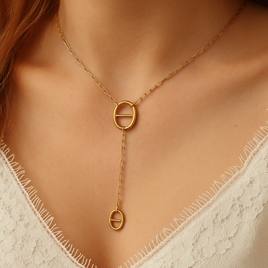Design : Maillon central signature + chute verticale terminée par un second maill