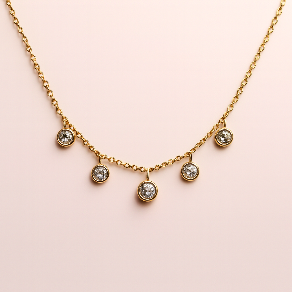 Un collier délicat et lumineux composé de cinq petits zircons ronds suspendus le long d’une chaîne dorée. Une pièce raffinée, fine et éclatante, parfaite pour illuminer le décolleté au quotidien comme pour les occasions.