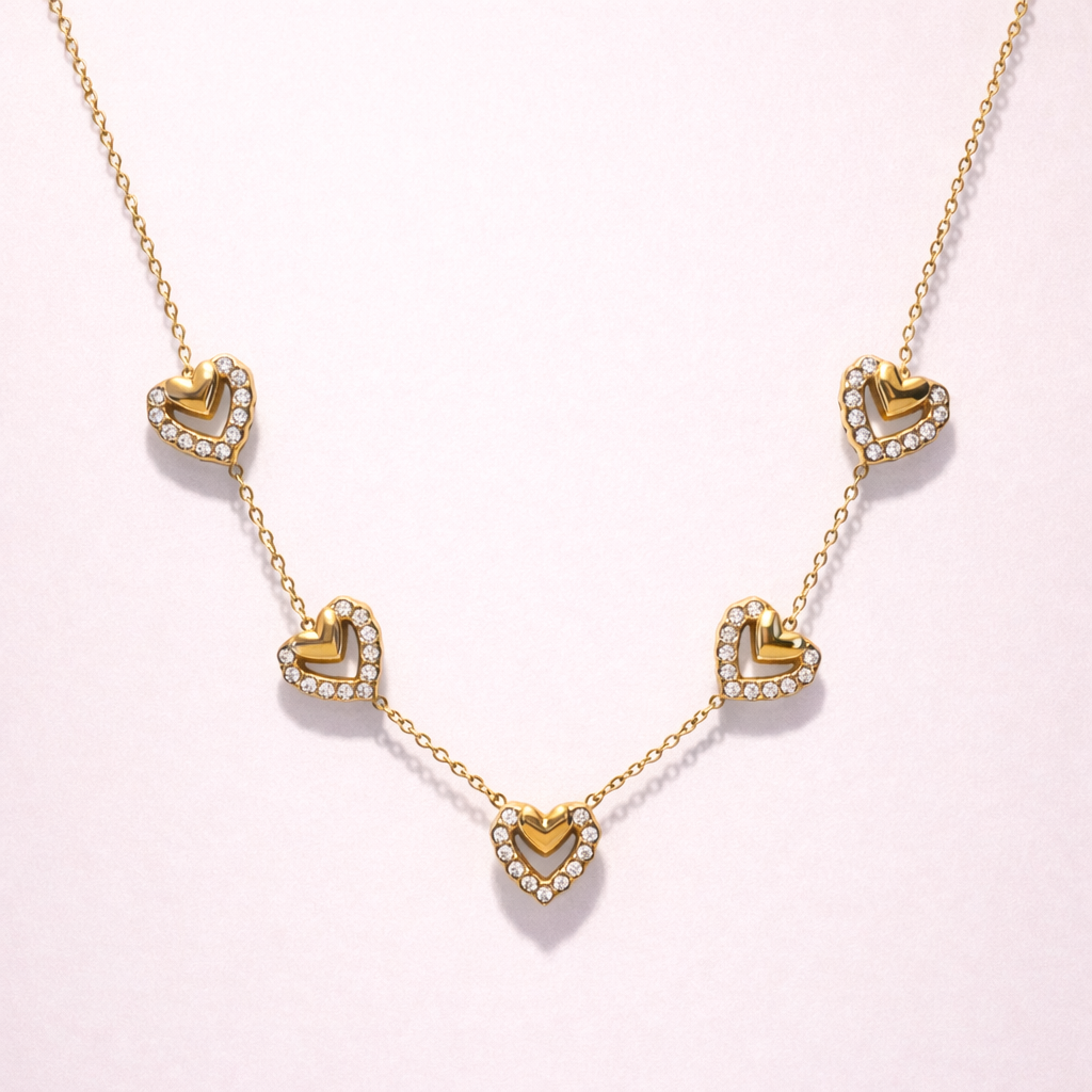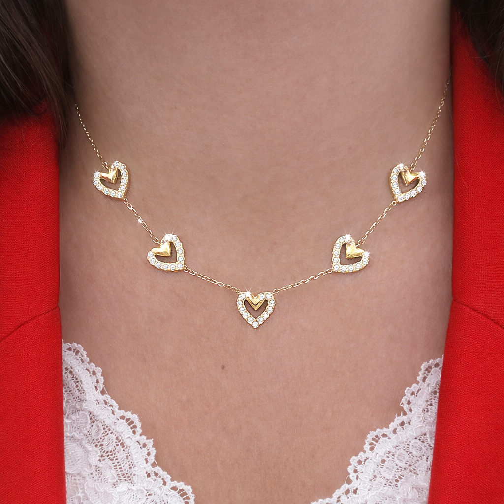 Délicat, lumineux et résolument féminin, le collier Lily sublime le décolleté avec une élégance naturelle. Ses petits cœurs délicatement sertis de zircons scintillants captent la lumière à chaque mouvement, apportant une touche romantique et raffinée à toutes vos tenues. Facile à porter au quotidien, il se suffit à lui-même ou s’associe parfaitement à d’autres colliers pour un look Mix & Match plein de charme.