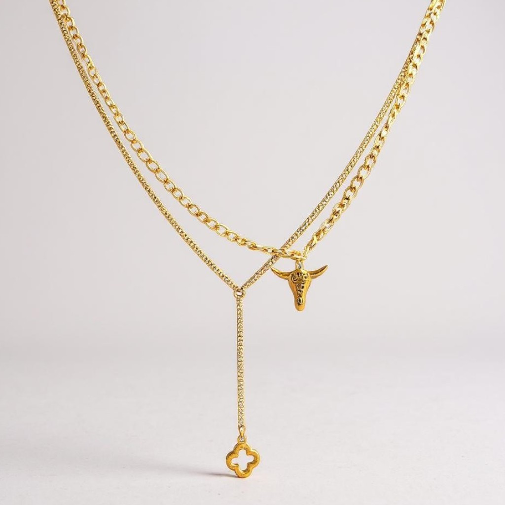 Un vent de liberté souffle dans votre style… Le collier double buffle associe deux chaînes élégantes à un pendentif tête de buffle finement émaillé, symbole de puissance et d’ancrage. L’allure est affirmée, sauvage et raffinée à la fois, grâce à son pendentif tombant en Y qui sublime le port de tête. Un bijou fort en caractère, pour les âmes libres.