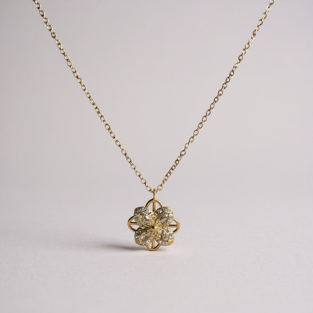✨ Élégant et ingénieux, ce collier en acier inoxydable doré cache un petit secret : son pendentif en forme de fleur ornée de strass peut tourner sur lui-même. Un bijou raffiné qui allie esthétique et fonction apaisante.