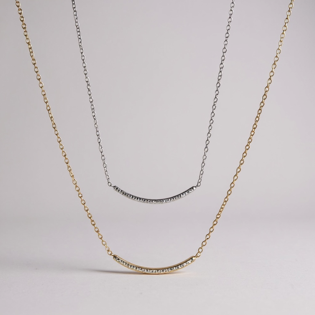 Un collier délicat et lumineux qui épouse naturellement la courbe du décolleté. Son pendentif en forme d’arc finement serti de zircons apporte une touche subtile de brillance, élégante et moderne.