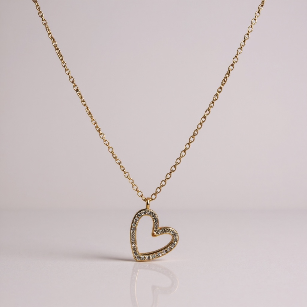 Délicat et lumineux, ce collier se distingue par son pendentif en forme de cœur ajouré, orné de petits strass scintillants. Un bijou raffiné qui capte la lumière à chaque mouvement et symbolise l’élégance romantique.
