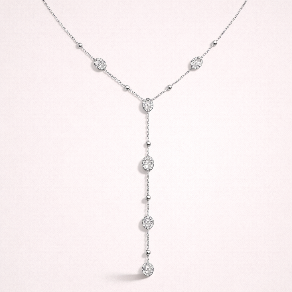 Sa silhouette en Y sublime le décolleté avec finesse, tandis que ses motifs ovales sertis de zircons captent subtilement la lumière. Les petites perles lisses intercalées apportent équilibre et modernité. Un bijou lumineux, féminin et raffiné, parfait pour illuminer une tenue du quotidien ou accompagner une occasion spéciale.