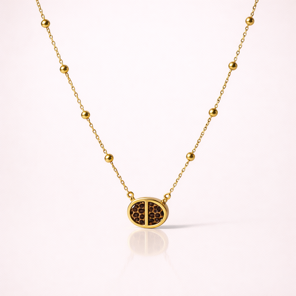 Audacieux et élégant, ce collier associe une fine chaîne dorée ornée de petites billes à un pendentif maille marine revisité avec un motif léopard. Ce contraste entre l’élégance du métal doré et l’esprit sauvage du motif animal apporte une touche moderne et tendance au bijou. Un collier original qui sublime le décolleté et apporte du caractère à toutes vos tenues.