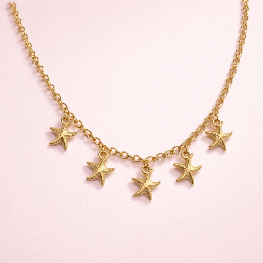 Délicat et lumineux, ce collier met en valeur une chaîne ornée de plusieurs étoiles de mer pendantes, inspirées de l’univers marin. Chaque pendentif apporte du mouvement et une touche estivale qui illumine le décolleté.