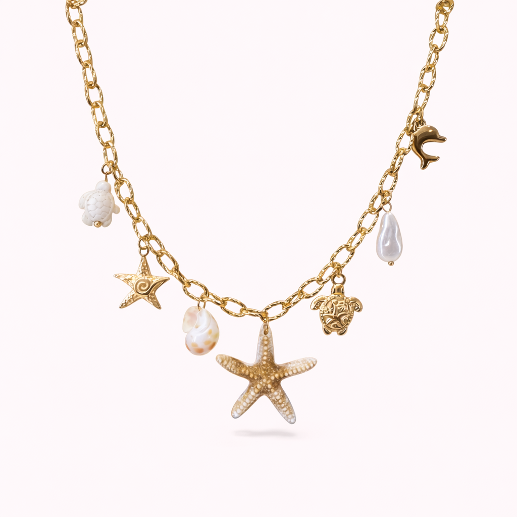 Une invitation au voyage… Ce collier doré orné de charms marines évoque les vacances, le soleil et l’évasion. Entre étoile de mer, coquillages et petites tortues, chaque détail raconte une histoire estivale pleine de douceur.