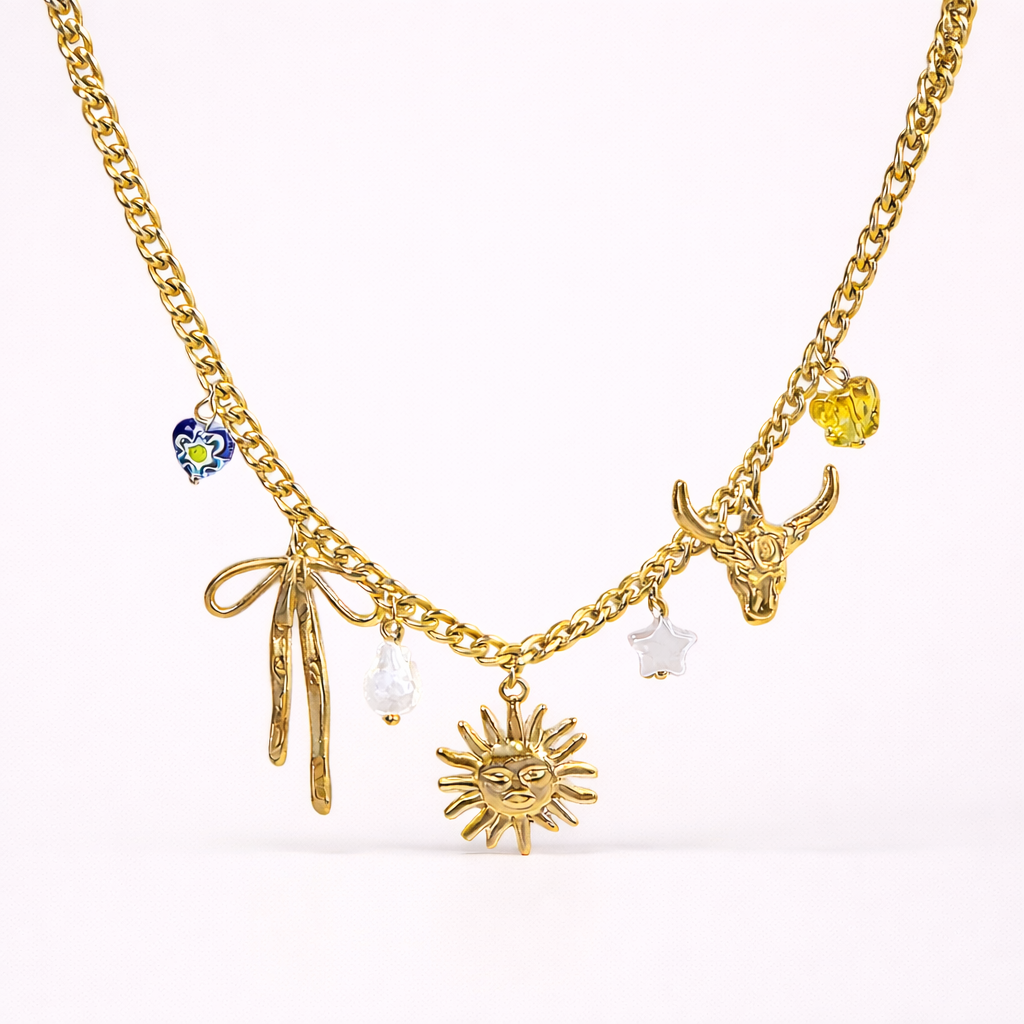 Plonge dans un univers solaire et audacieux avec ce collier en acier inoxydable doré. Sa chaîne épaisse met en valeur des charms uniques : soleil rayonnant, tête de taureau, nœud ruban, perle baroque, étoile nacrée, cœur émaillé et pierre jaune facettée. Un bijou à la fois bohème et affirmé, idéal pour sublimer un style chic et original.