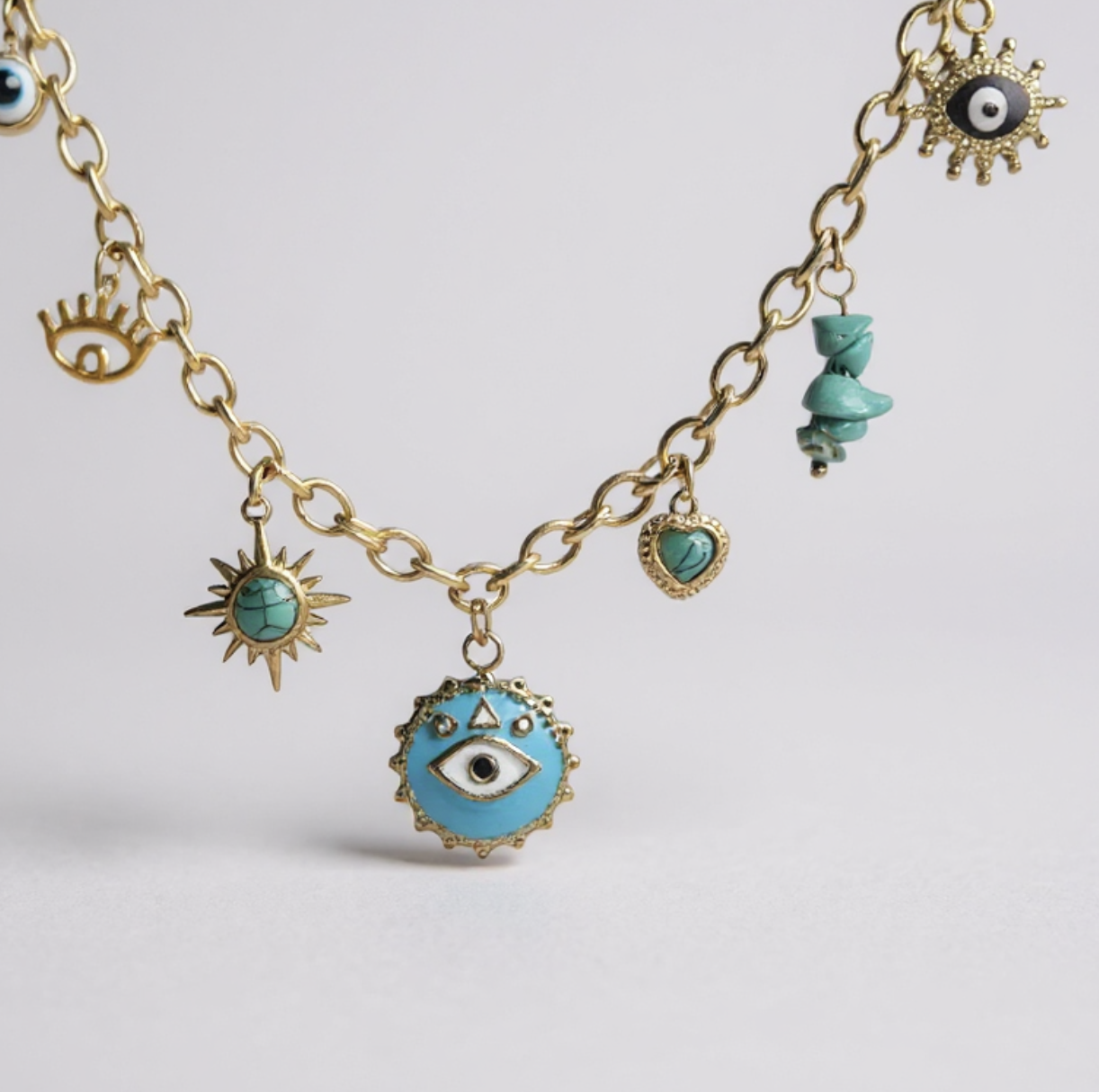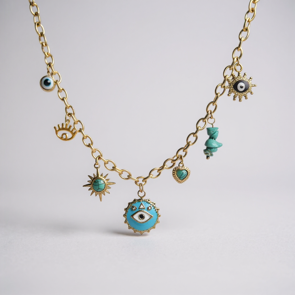 Un collier protecteur et raffiné qui mêle symboles et éclat doré. Orné de charms en forme d’yeux, de soleil, de cœur et de pierres turquoise, il allie style et signification. Un bijou tendance qui attire les regards et accompagne toutes tes tenues.