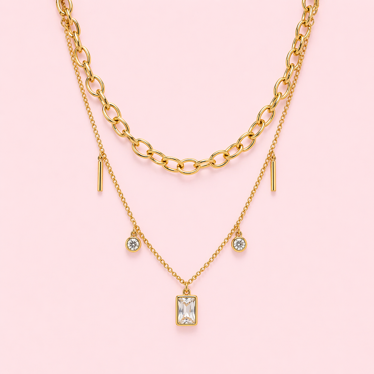 Ce collier double rang associe une chaîne à maillons larges et une chaîne fine ornée de pendentifs brillants, dont une pierre centrale rectangulaire. Un équilibre parfait entre modernité et élégance.