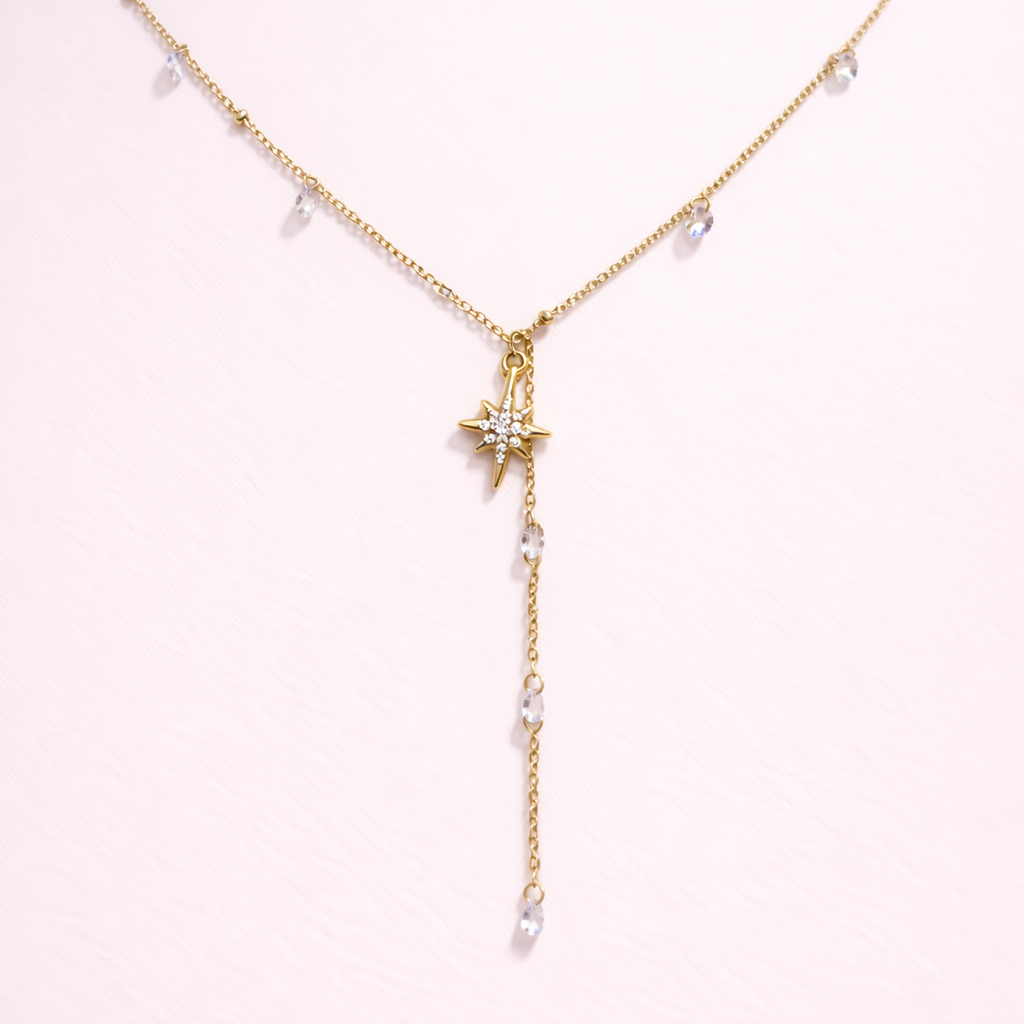 Délicat et lumineux, ce collier en forme de Y met en valeur une fine chaîne ornée de petites pierres scintillantes qui captent la lumière avec élégance. Au centre, une étoile sertie de zircon apporte une touche céleste et raffinée.