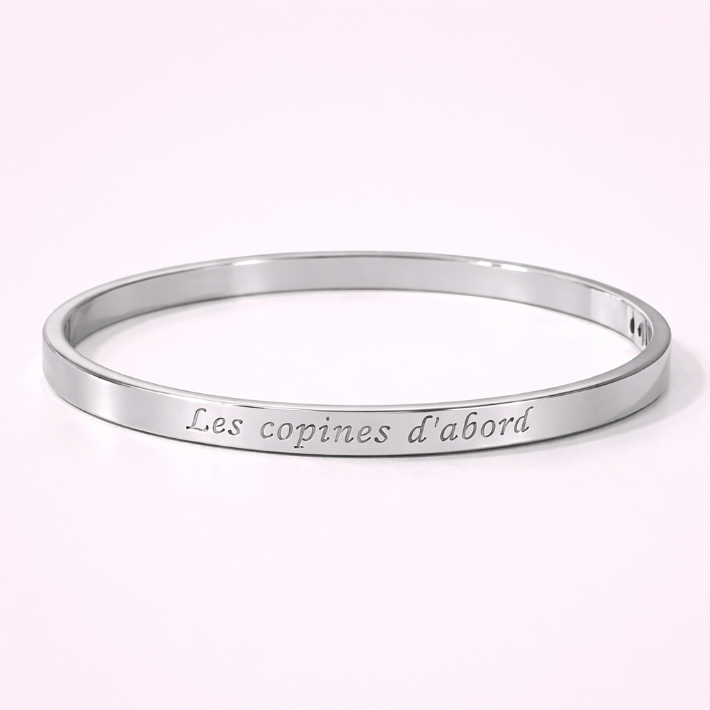 Ce jonc fin et élégant en acier inoxydable est gravé du message « Les copines d’abord », une déclaration fun et sincère pour celles qui comptent vraiment. Disponible en version dorée ou argentée, il s’adapte à tous les styles et toutes les envies. Un cadeau parfait entre amies, pour marquer une complicité unique.