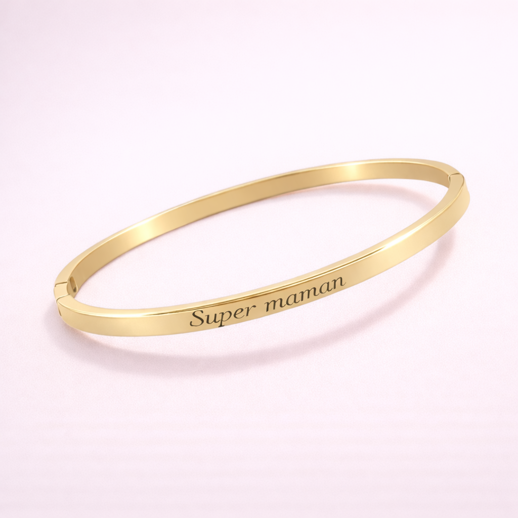Ce jonc fin et élégant en acier inoxydable doré est gravé du mot « Super Maman », pour rappeler chaque jour à celle qui le porte combien elle est unique. Un cadeau idéal pour la fête des mères, un anniversaire ou simplement pour faire plaisir.