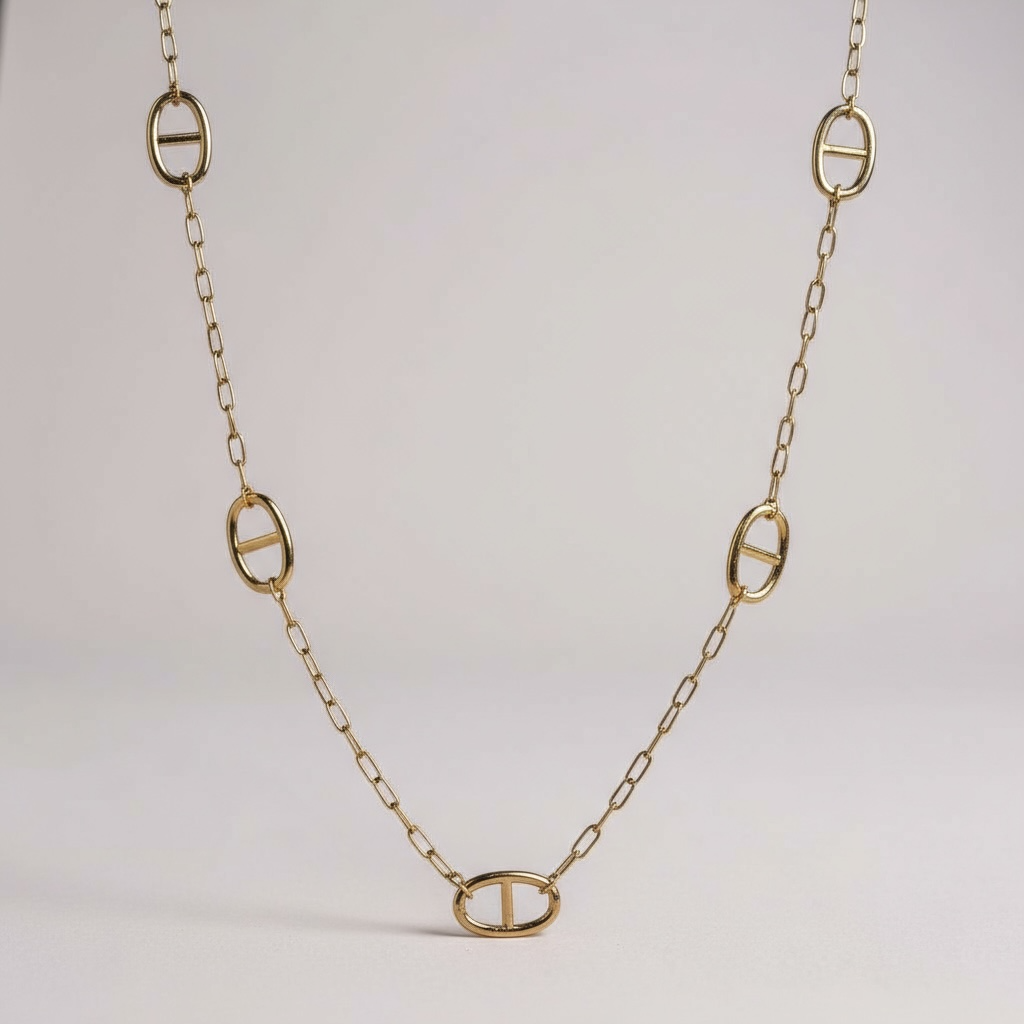Composé de 5 maillons ovales ajourés, ce sautoir en acier inoxydable doré se distingue par son éclat subtil et sa fluidité parfaite.