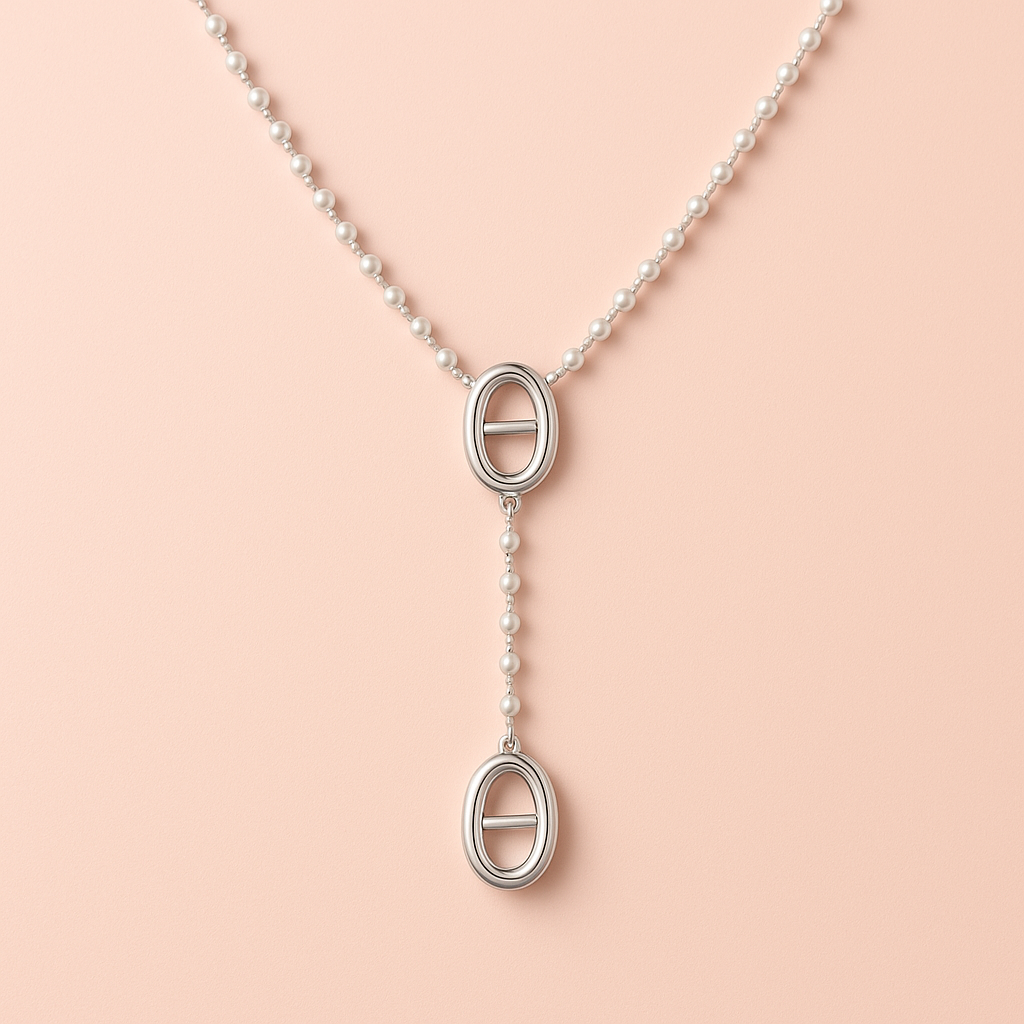 Ce collier sublime marie la finesse des perles et l’allure moderne de la maille marine. Sa silhouette en Y, ponctuée de deux pendentifs ovales signature, crée une ligne élégante qui affine le port de tête et apporte un charme unique à la tenue. Un bijou raffiné, féminin et intemporel, parfait pour sublimer une robe, un décolleté ou un look chic du quotidien.