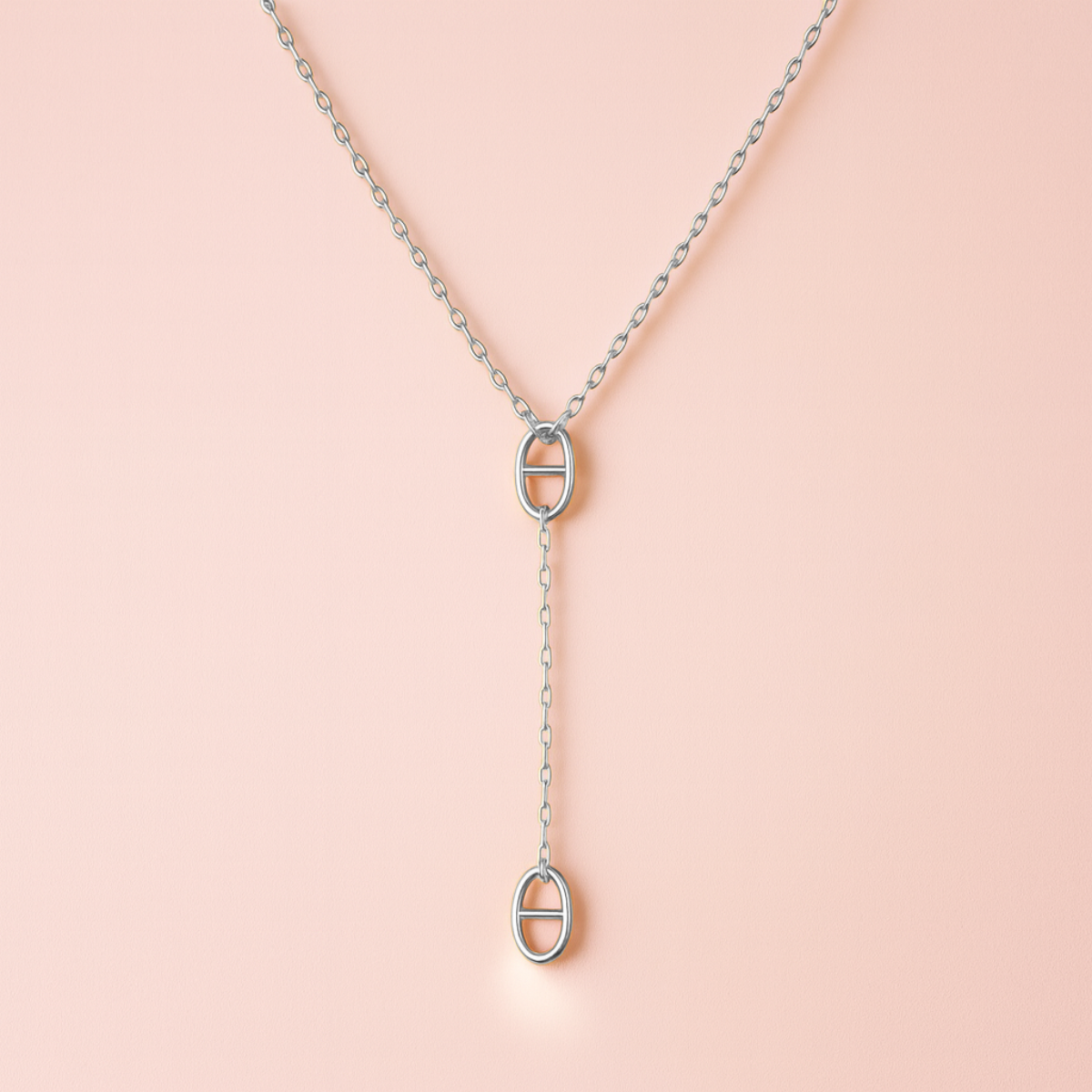 Un collier Y délicat et raffiné, sublimé par deux maillons maille marine ajourés qui créent une ligne verticale élégante. Son design minimaliste apporte instantanément une touche chic à n’importe quelle tenue, tout en restant léger et facile à porter.