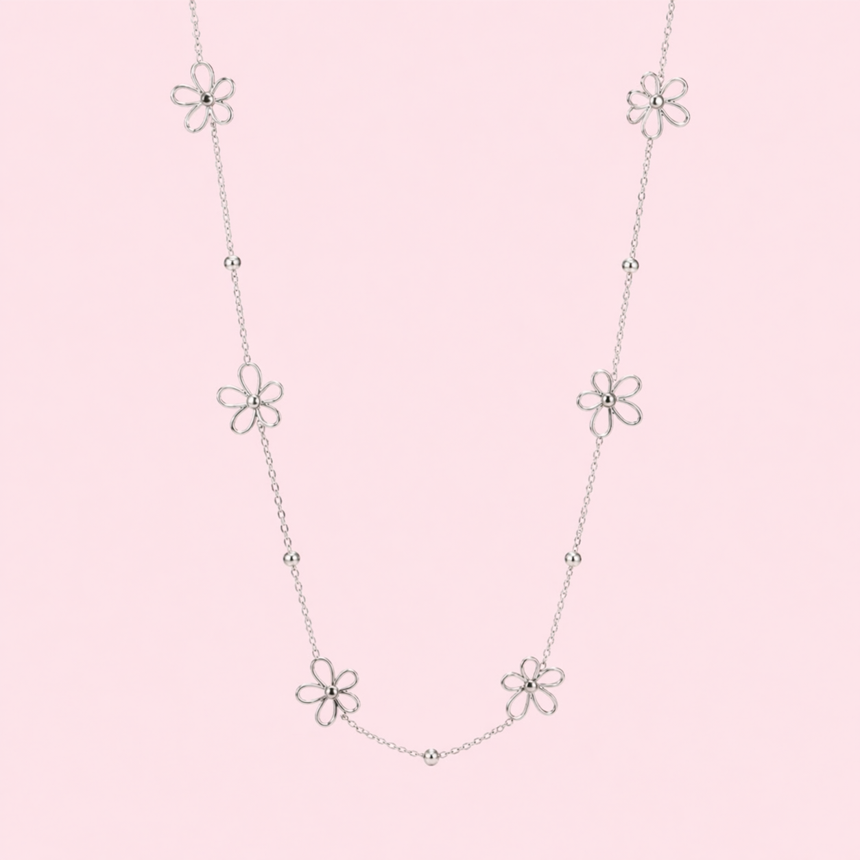Ce sautoir long est orné de petites fleurs délicatement réparties sur toute la chaîne, créant un effet léger et raffiné qui accompagne chacun de vos mouvements.